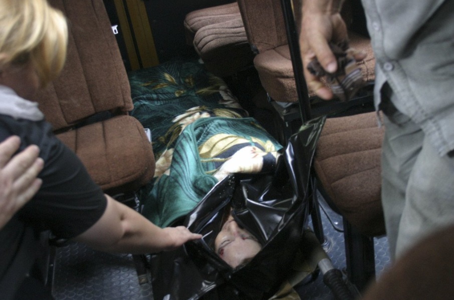 Folk ser på et kulehull i ansiktet til den drepte russiske menneskerettighetsaktivisten Natalya Estemirova. (Kilde: Murad Musayev via Getty Images)