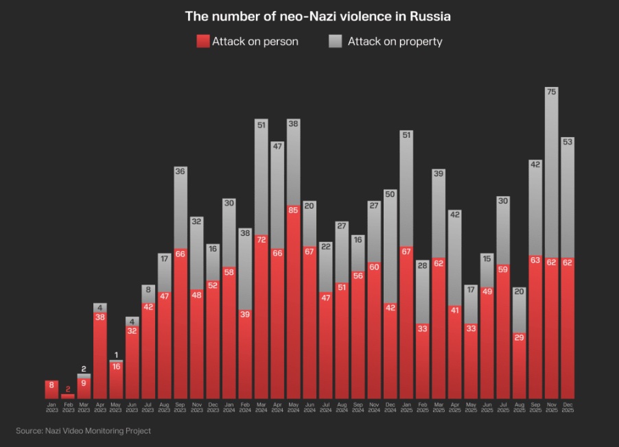 Graf som viser antall tilfeller av nynazistisk vold i Russland, fordelt på angrep på personer og angrep på eiendom, siden januar 2023. (Kilde: Informasjon via Nazi Video Monitoring Project)