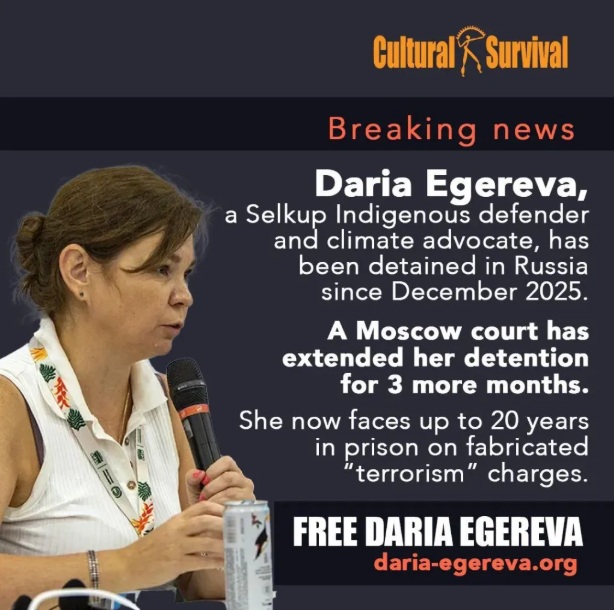 Den 17. desember 2025 ble Daria Egereva arrestert i Moskva. Hun er en menneskerettighetsforkjemper for urfolk i Selkup, medleder for International Indigenous Peoples’ Forum on Climate Change (IIPFCC), og medlem av FNs urfolks koordineringsorgan (UN ICB). Hun er sikta for deltaking i aktivitetene til en såkalt «terrororganisasjon», en forbrytelse som kan medføre en straff på 10 til 20 års fengsel.